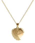 - 10K Yellow Gold Locket Urn - An angel's wing is etched into the front of this heart-shaped locket. Open locket to reveal photo and engraving. The safety chamber that holds cremated ashes is accessed through a screw in the back of the locket.