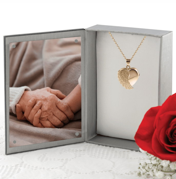 A beautiful angel’s wing rests on the front of this gold locket urn.