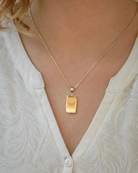 - 10 Karat Yellow Gold Rectangle Urn Necklace. The safety chamber that holds cremated ashes is accessed through a screw in the back of the pendant.
