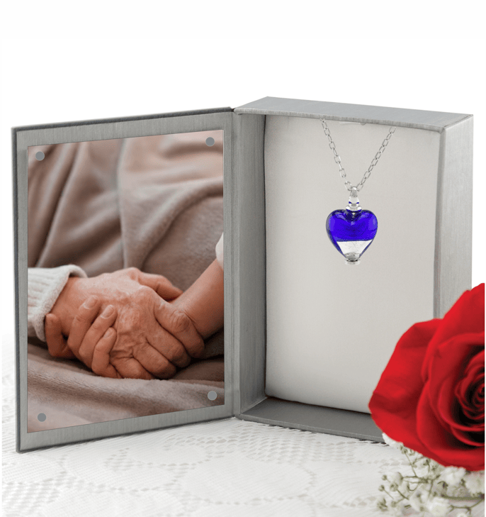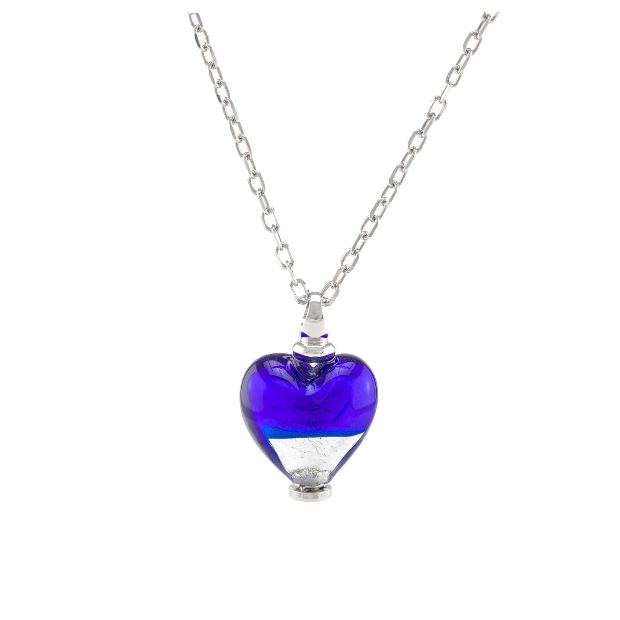 This blue and silver Murano glass heart urn necklace is designed to hold a small amount of cremated remains, hair or any other memento you wish to keep close to your heart.