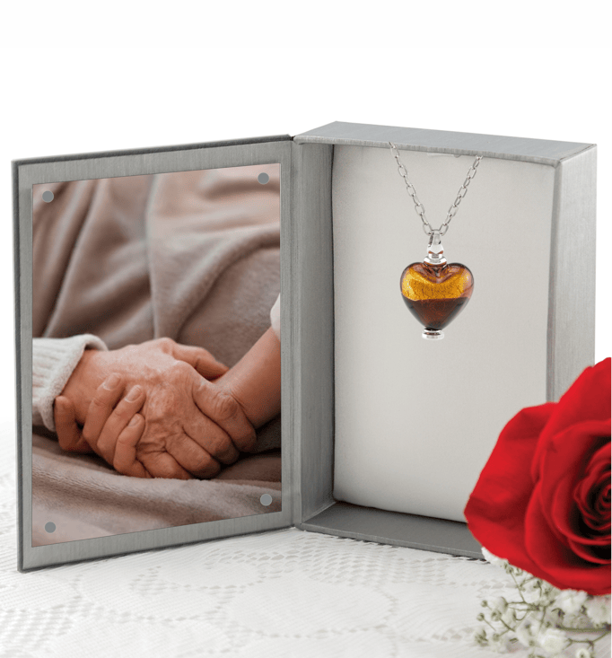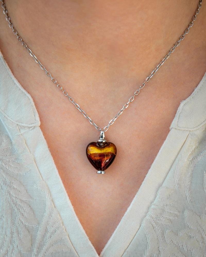 This gold and brown Murano glass heart urn necklace is designed to hold a small amount of cremated remains, hair or any other memento you wish to keep close to your heart.