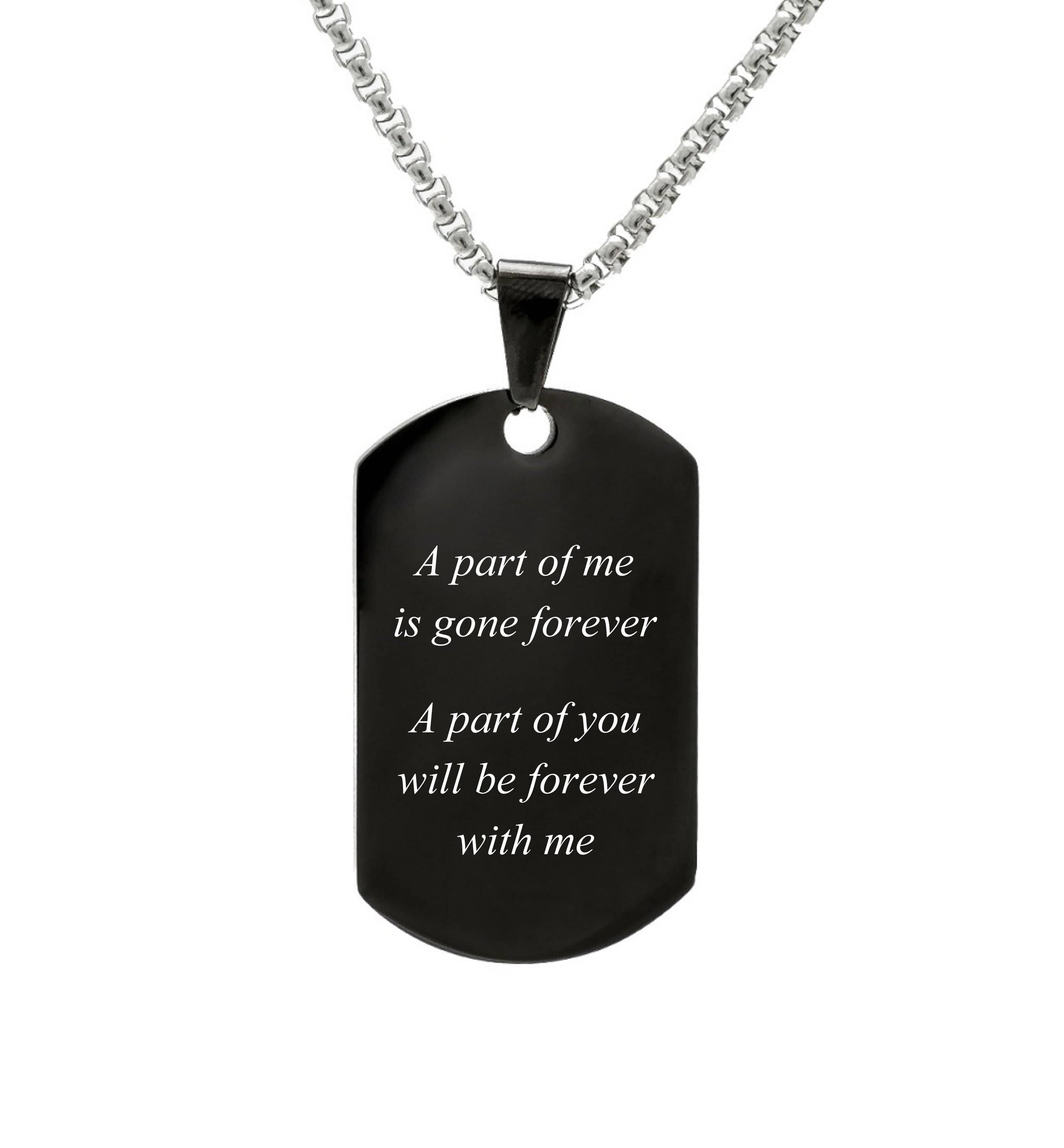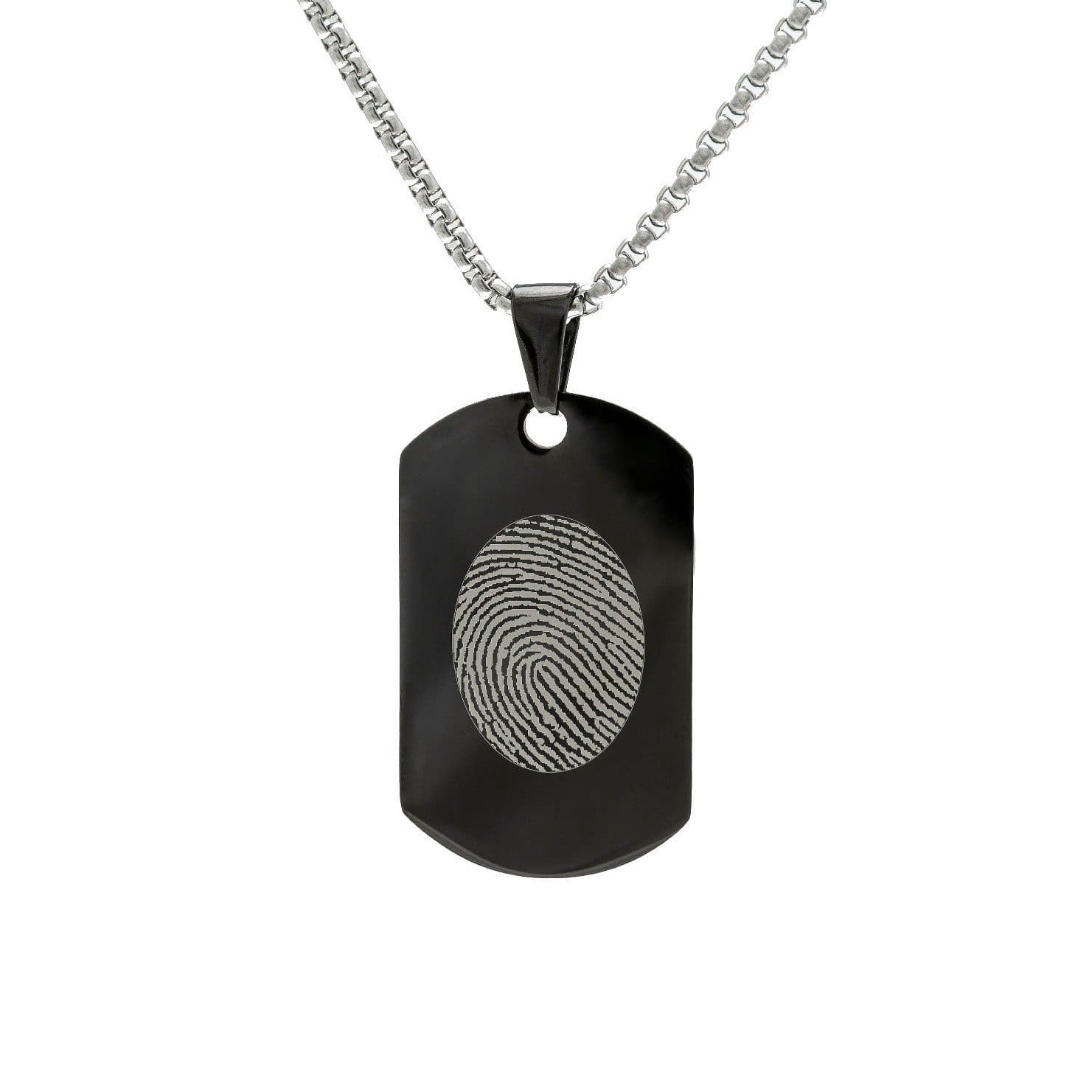 Personalize your Black Stainless Steel Tag Pendant with a fingerprint, photo, text or handwriting. The engraving shows up silver - ensuring a nice contrast against the black stainless steel.