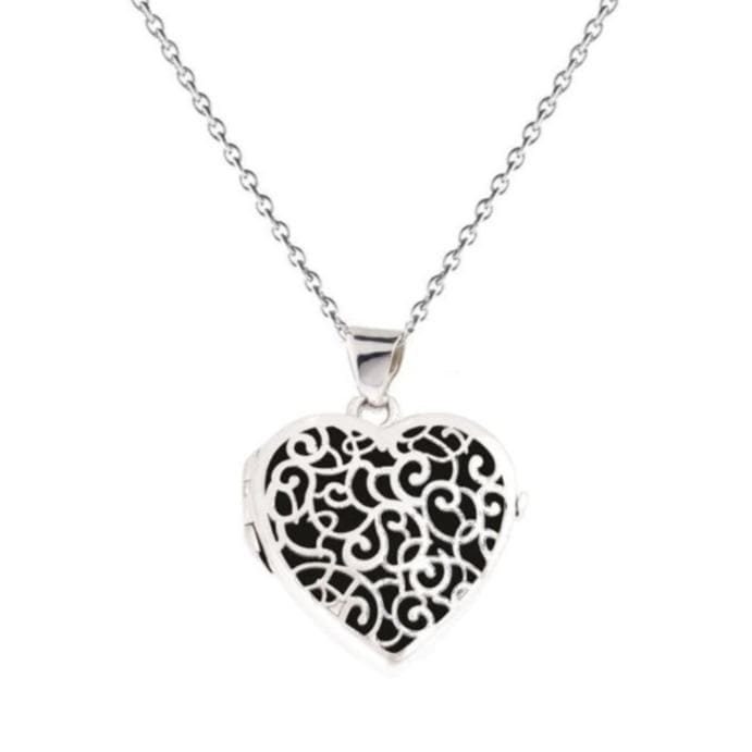 - Sterling Silver Filigree Heart Locket Urn Necklace for Ashes. Open locket to reveal photo and engraving. The safety chamber that holds cremated ashes is accessed through a screw in the back of the locket.