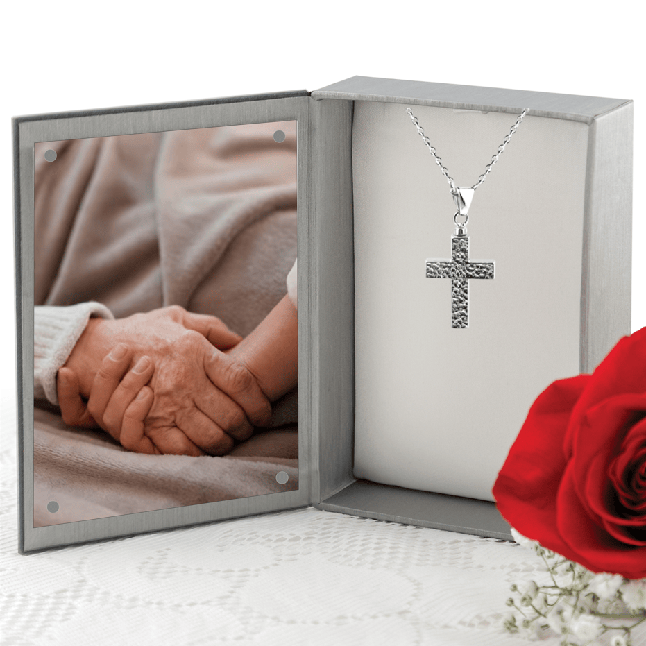 This beautifully crafted hammered cross urn necklace holds cremated ashes.