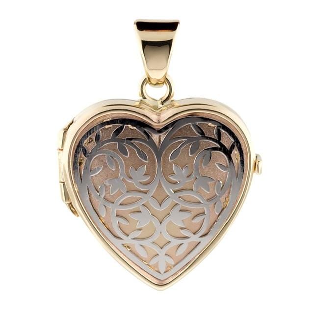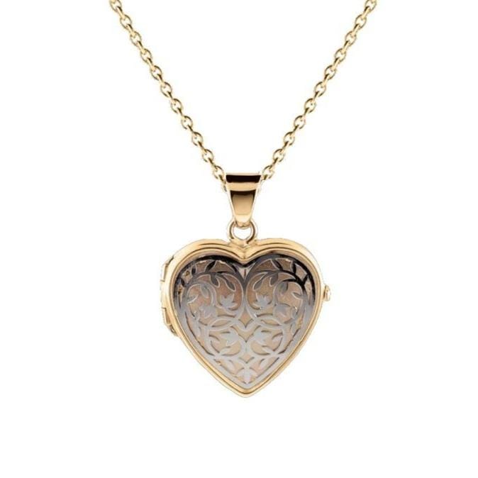 n intricate design of leaves and flowers grace the front of this two-toned gold heart locket. This heart-shaped design is 10K yellow gold with white gold inlay.