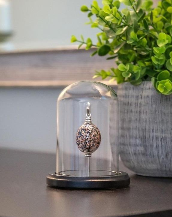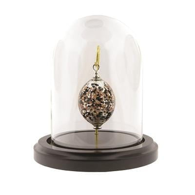 This mini keepsake urn is handcrafted from genuine Murano glass. It hangs suspended in a glass dome on a wooden base. It safely and securely holds a small amount of cremated ashes. The glass dome can be personalized with an engraved message.