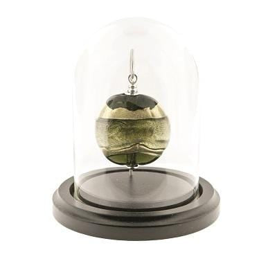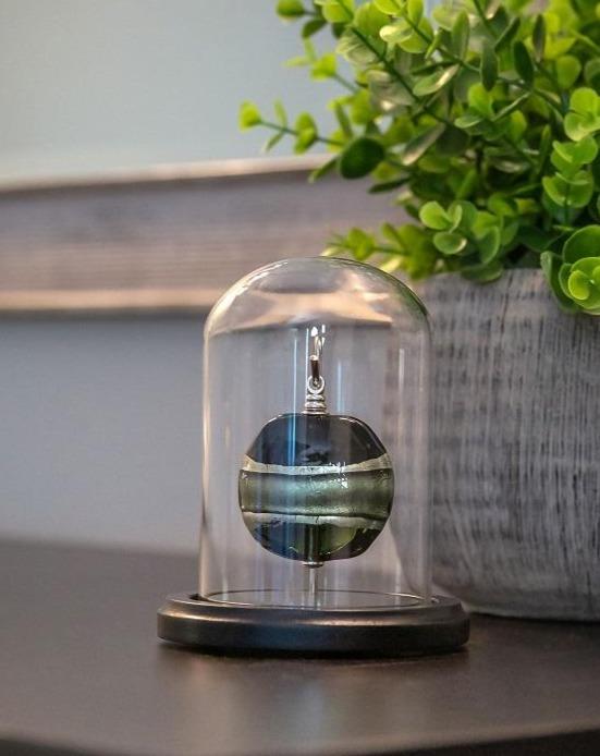 This mini keepsake urn is handcrafted from genuine Murano glass. It hangs suspended in a glass dome on a wooden base. It safely and securely holds a small amount of cremated ashes. The glass dome can be personalized with an engraved message.