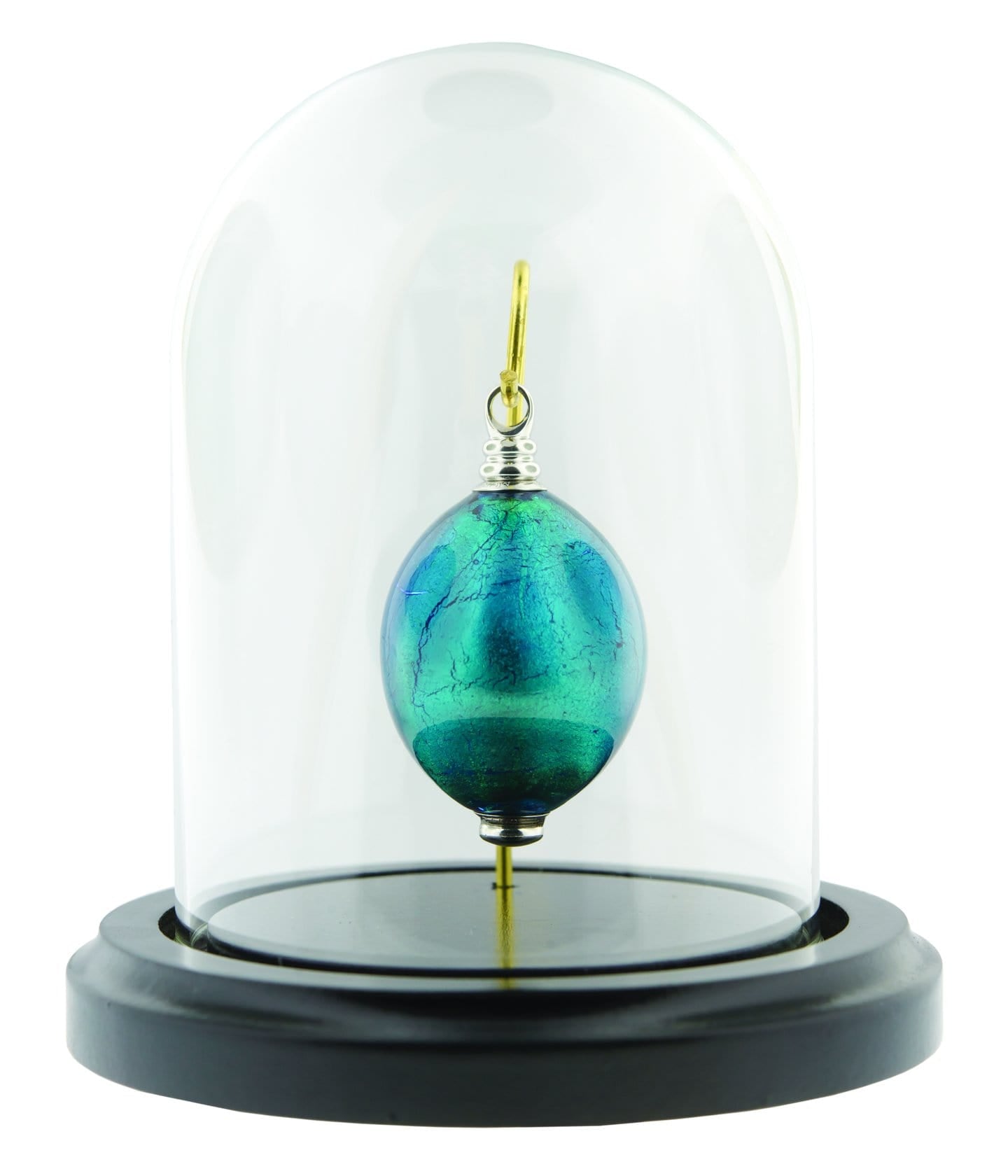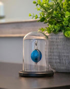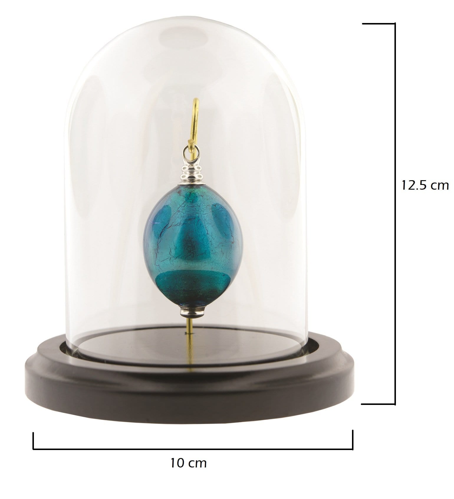 This mini keepsake urn is handcrafted from genuine Murano glass. It hangs suspended in a glass dome on a wooden base. It safely and securely holds a small amount of cremated ashes. The glass dome can be personalized with an engraved message.