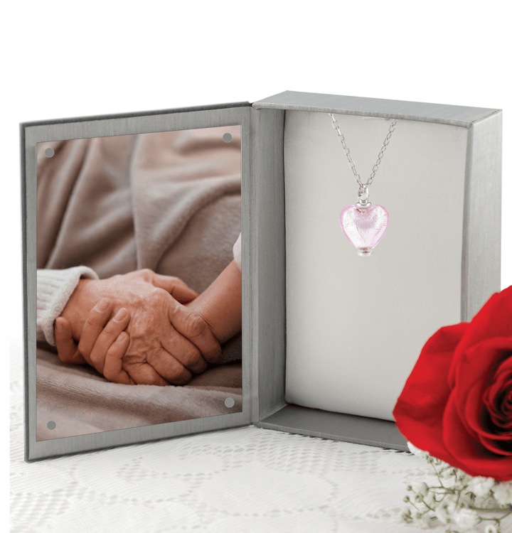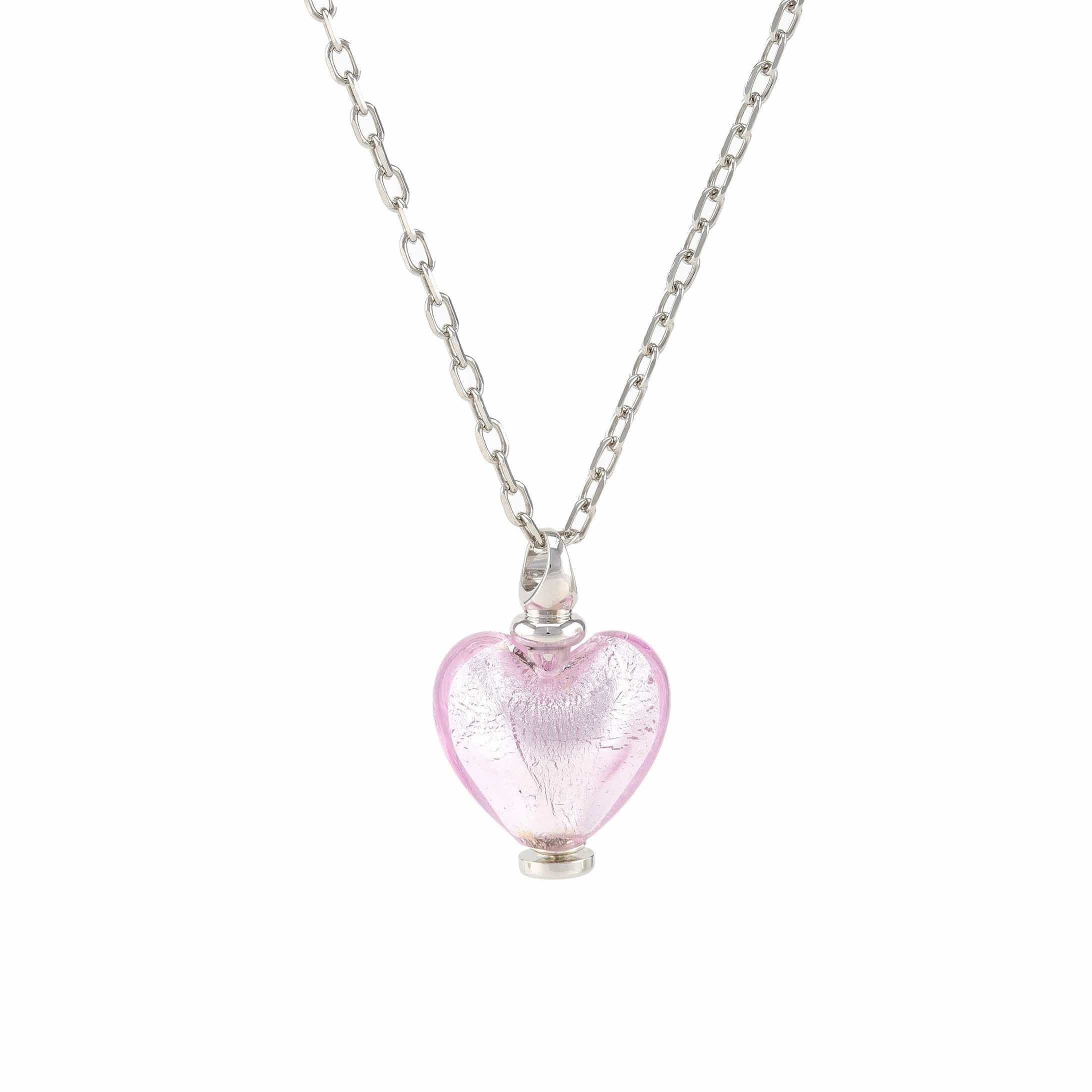This soft pink Murano glass heart urn necklace is designed to hold a small amount of cremated remains, hair or any other memento you wish to keep close to your heart.
