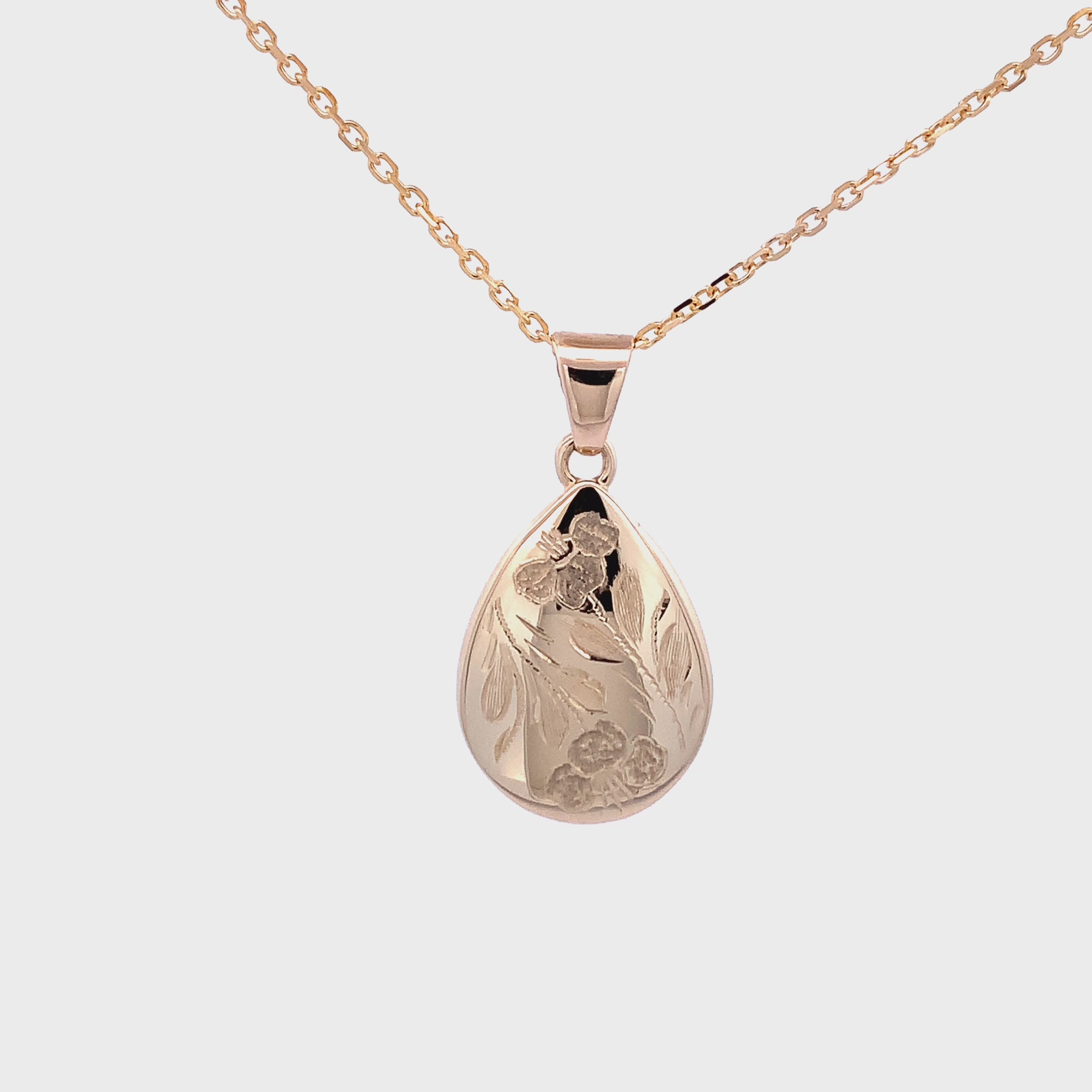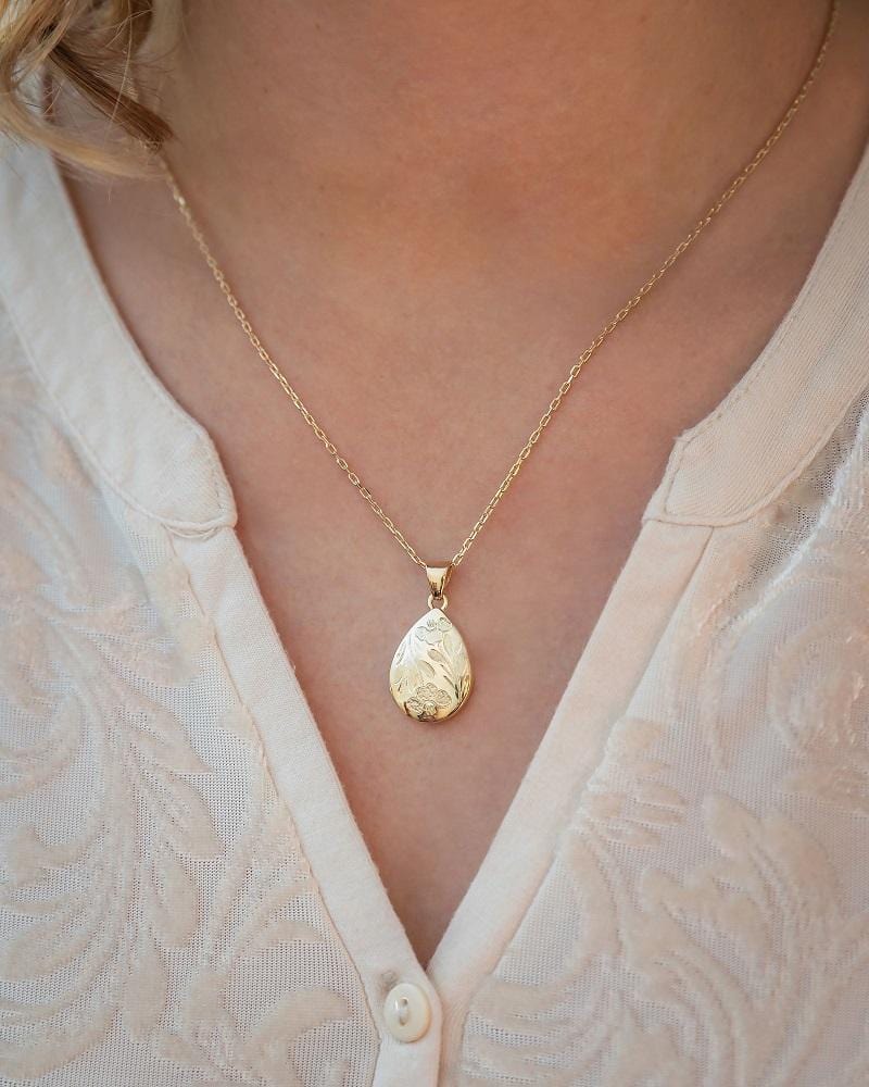 This uniquely shaped gold teardrop urn necklace has hand engraved poppies etched into the front.