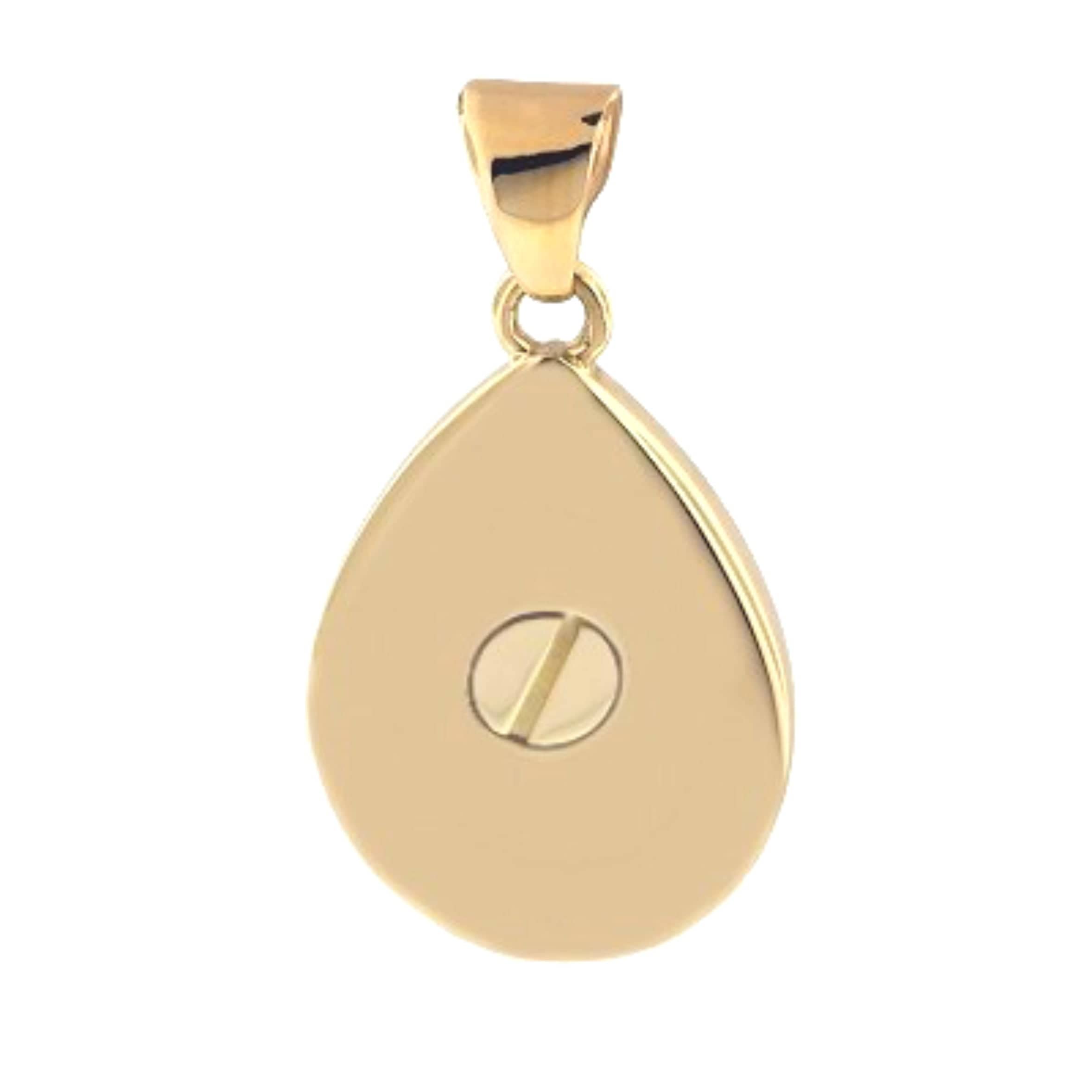 - 10 Karat Yellow Gold Teardrop Urn - 'Poppy'. The safety chamber that holds cremated ashes is accessed through a screw in the back of the pendant.