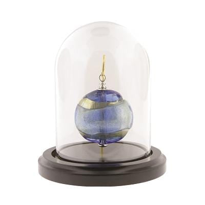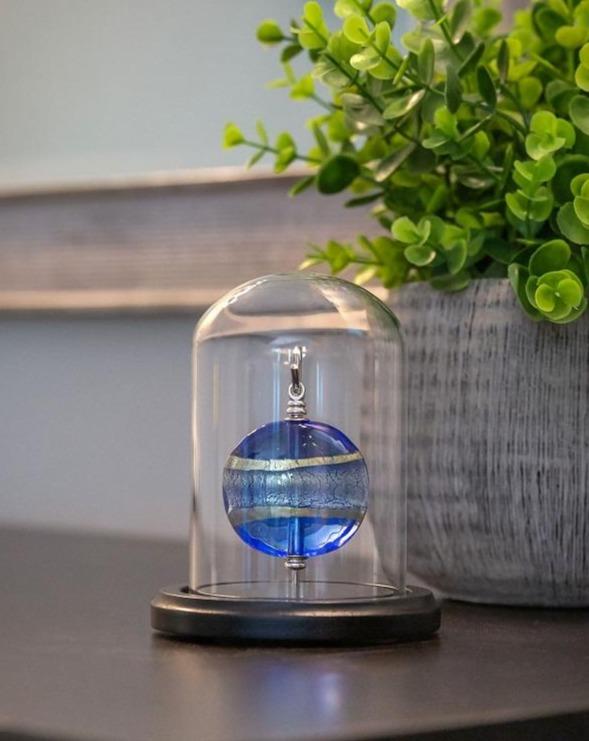 his mini keepsake urn is handcrafted from genuine Murano glass. It hangs suspended in a glass dome on a wooden base. It safely and securely holds a small amount of cremated ashes. The glass dome can be personalized with an engraved message.