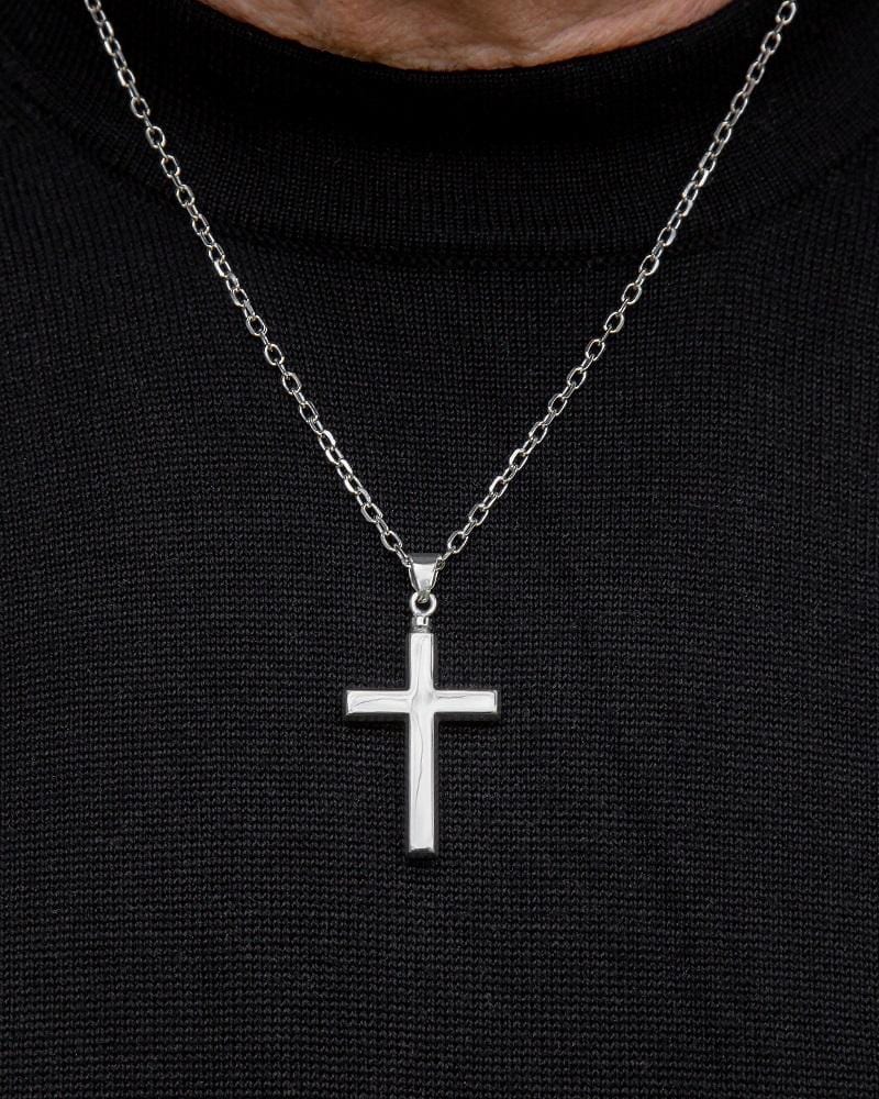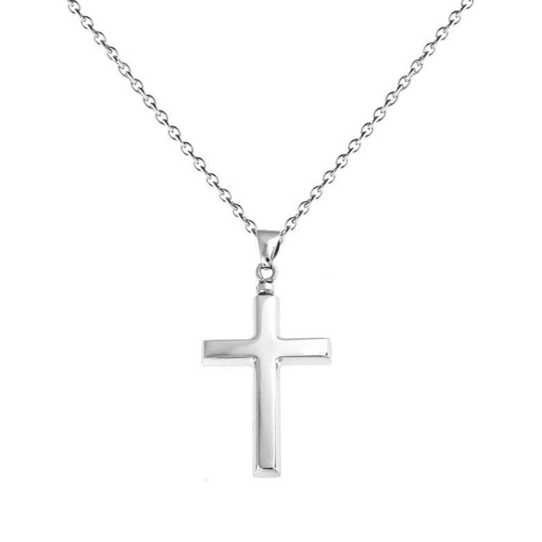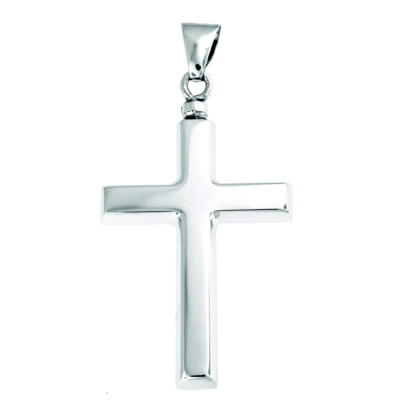 - Sterling Silver Cross Pendant Urn Necklace. The safety chamber that holds cremated ashes is accessed through a screw at the top of the pendant.