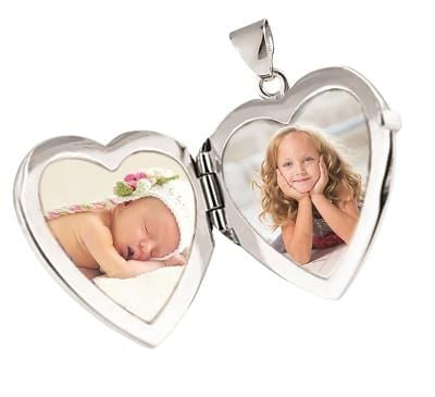 Choose a silver locket that opens to reveal two photos with the option to engrave the back. Choose a locket with one photo and engraving on the inside (see photos to view examples).
