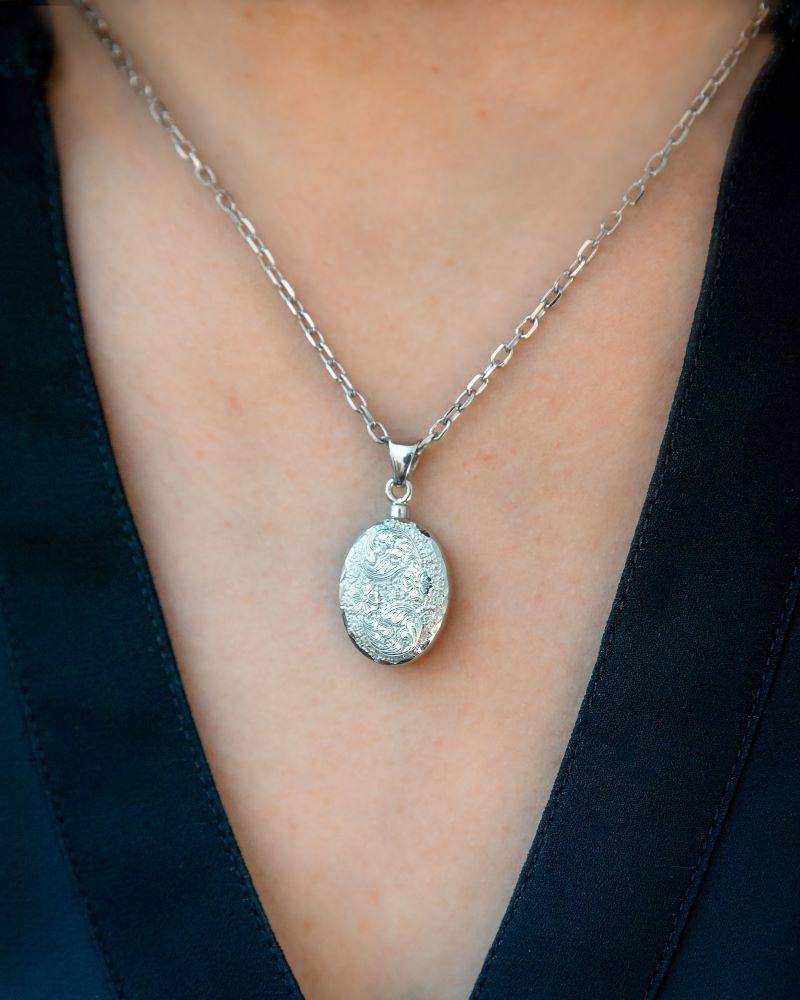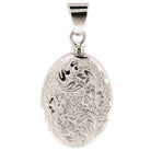 This silver oval pendant urn is a top filling urn. The top unscrews and can be filled with ashes so the back of the pendant can be engraved.