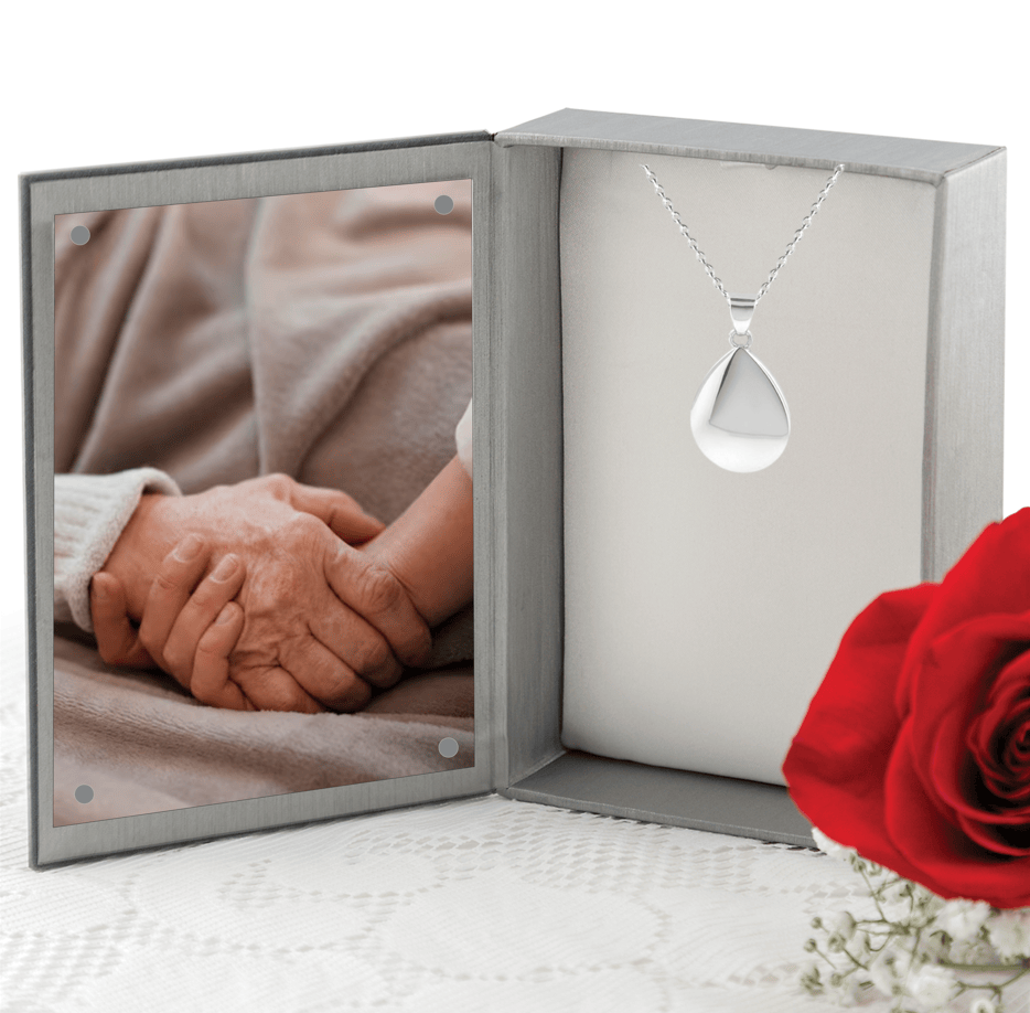 This teardrop urn necklace can be uniquely designed by you - your choice of engraved fingerprint, engraved phrase, handwriting, picture. The options are endless and all personalization is included in the cost of your pendant urn.
