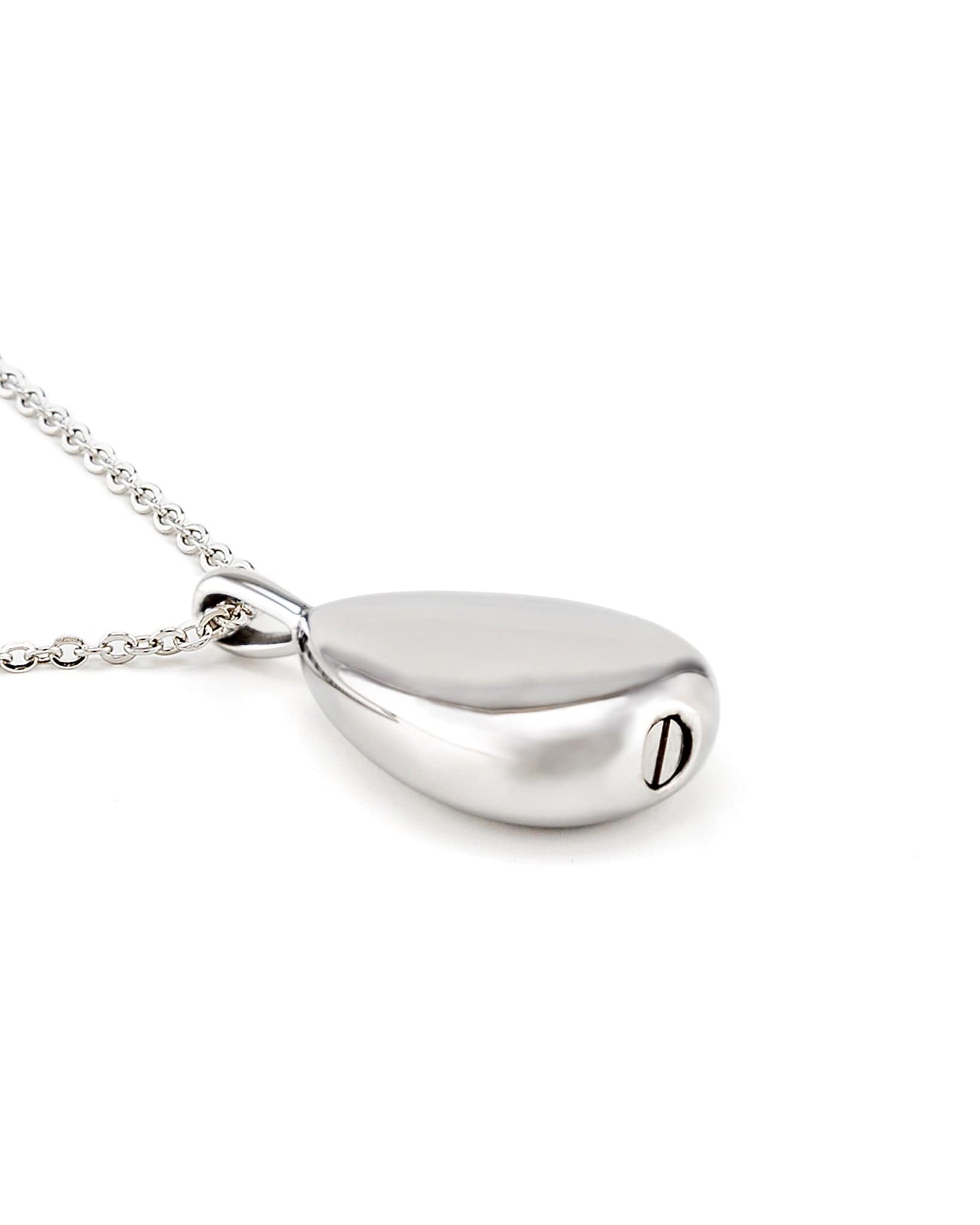 - Stainless Steel Teardrop Pendant Urn. The safety chamber that holds cremated ashes is accessed through a screw at the bottom of the pendant.
