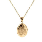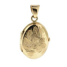 Hand engraved wildflowers are etched into the front of this oval-shaped Gold Locket. This Classic Locket holds two pictures.